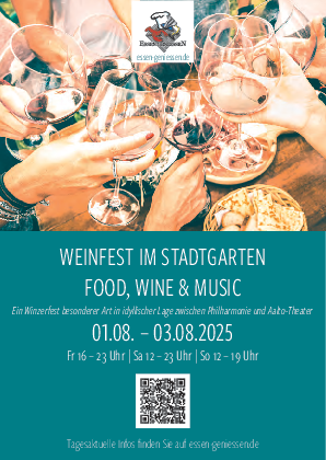 In der Stadt Essen lässt es sich gut leben und wir Essenerinnen und Essener kommen gerne zum Schmausen und Plaudern zusammen. Auch die Freundinnen und Freunde aus den Anrainer-Städten sind immer herzlich willkommen. Anfang August ist wieder eine prima Gelegenheit dazu, sich zu treffen und das Zusammensein mit Premium-Weinen und gutem Essen zu genießen.